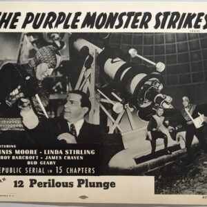ORIGINAL SERIAL LOBBY CARD – THE PURPLE MONSTER STRIKES (f) – R1957 – title card – Ch 12 “Perilous Plunge” – Roy Barcroft, Dennis Moore, Linda Stirling, James Craven