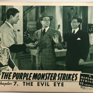 ORIGINAL SERIAL LOBBY CARD – THE PURPLE MONSTER STRIKES (c) – 1945 – scene card – Ch 7 “The Evil Eye” – Roy Barcroft, Dennis Moore, Linda Stirling, James Craven