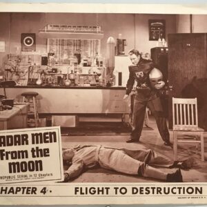 ORIGINAL SERIAL LOBBY CARD – RADAR MEN FROM THE MOON – 1952 – scene card – Ch 4 “Flight to Destruction” – George Wallace, Aline Towne, Roy Barcroft, Clayton Moore